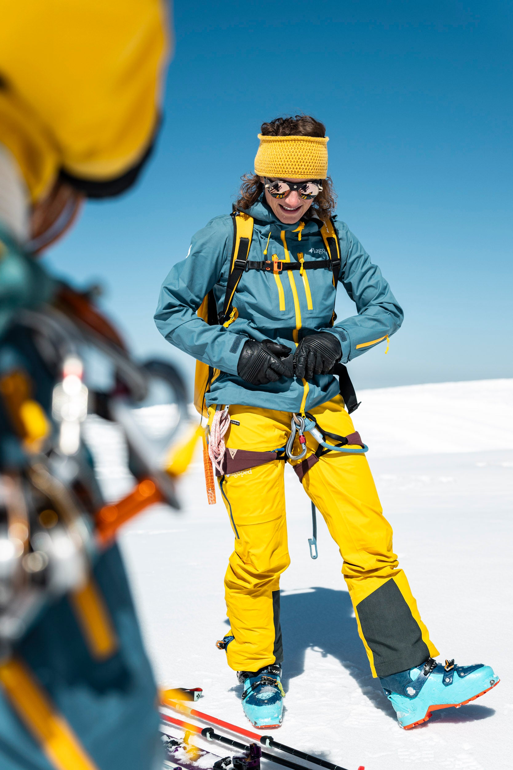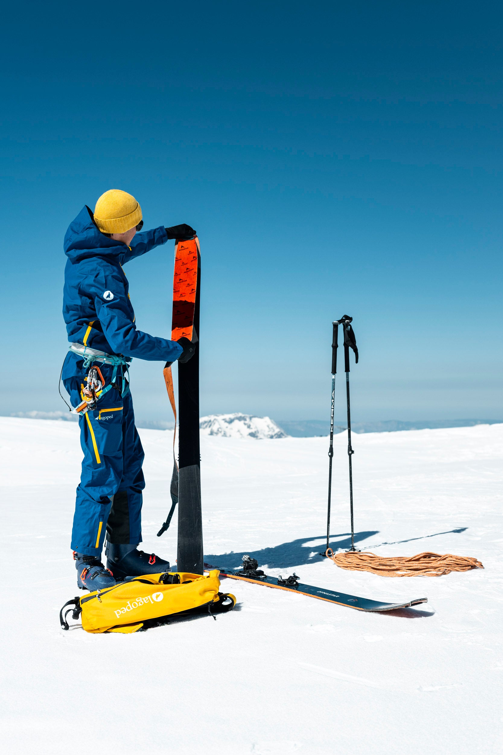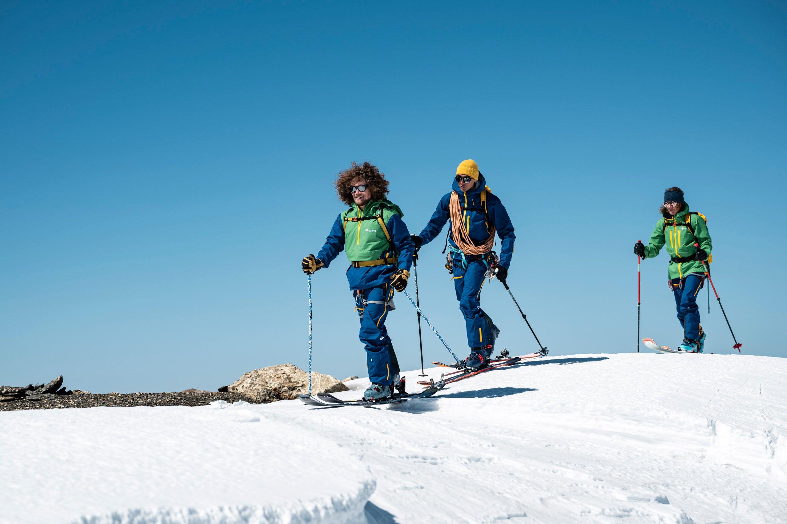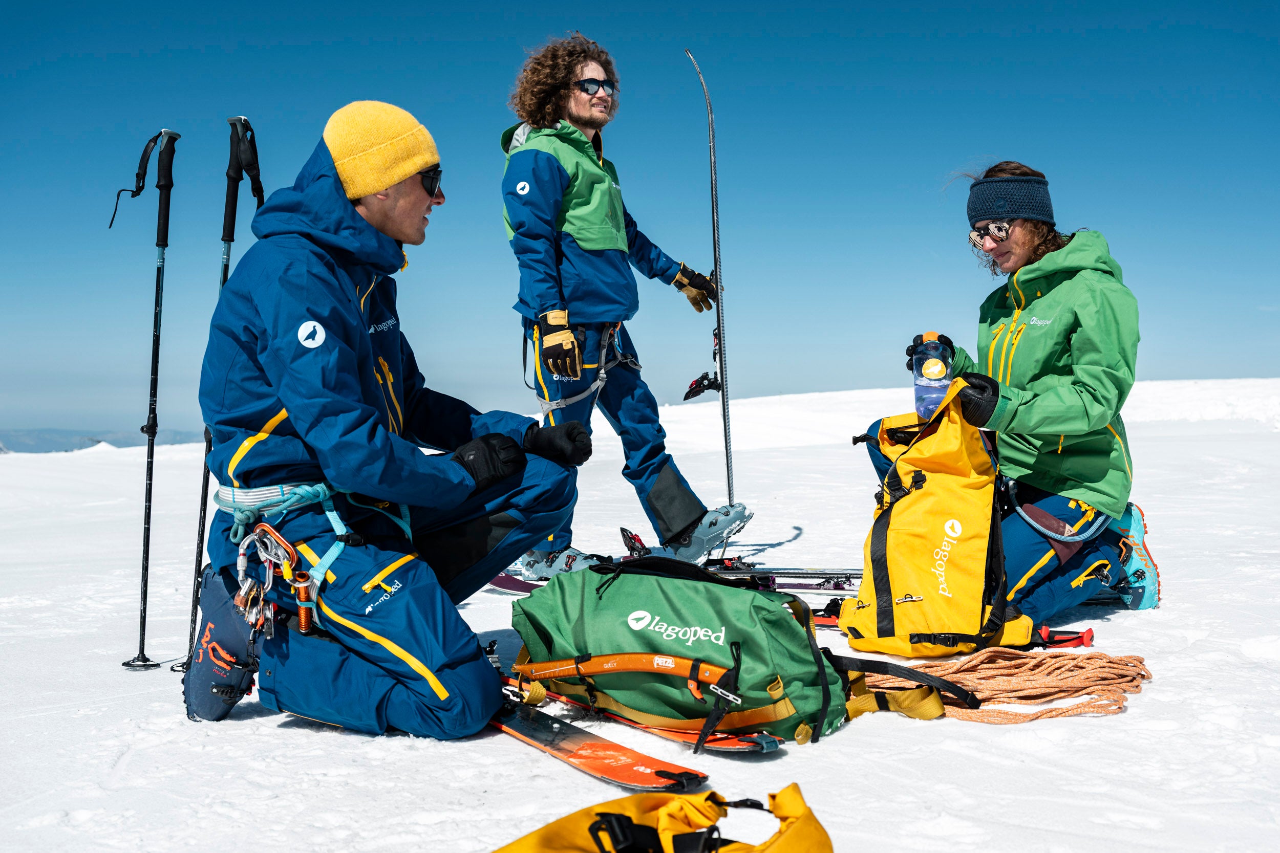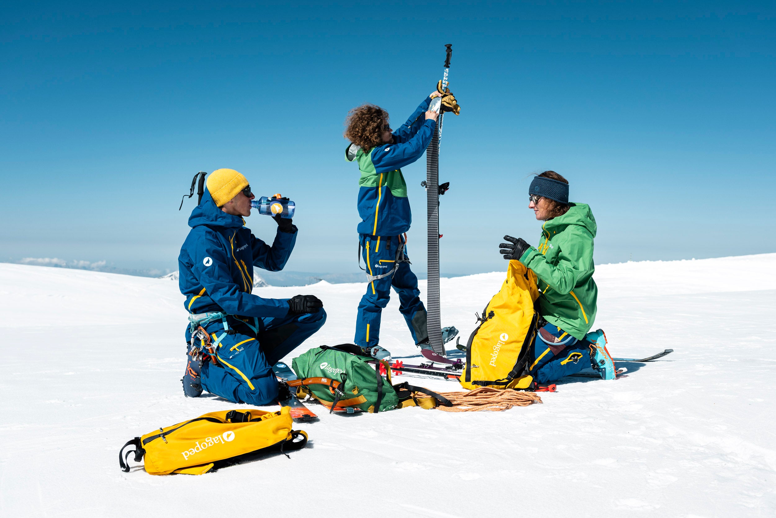 Une matinée d'avril 2025, l'air est vif, chargé de cette promesse de printemps qui n'a pas encore tout à fait chassé l'hiver. Pilou Cret, enfant du pays et guide de haute montagne, nous accueille avec ce sourire tranquille de ceux qui connaissent chaque ride du glacier. À ses côtés, Clémentine et Paul de Pourtalès, l’athlète Freeride de la Lagoped Family, engagé sur le Freeride World Tour en 2026.